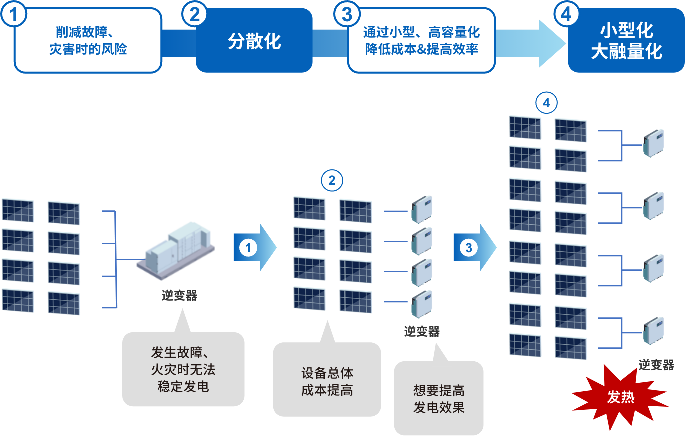 近年來,太陽能發(fā)電系統(tǒng)上的需求不斷發(fā)生變化。作為地震或水災(zāi)等災(zāi)害風(fēng)險(xiǎn)對策,更加穩(wěn)定的電力供給需求愈發(fā)高漲,并出現(xiàn)了從集中型系統(tǒng)向分散型系統(tǒng)轉(zhuǎn)化的趨勢。并非通過1臺光伏逆變器執(zhí)行電力轉(zhuǎn)換,而是分散至多臺光伏逆變器,由此降低了發(fā)生災(zāi)害時(shí)因設(shè)備故障等所致發(fā)電停止的風(fēng)險(xiǎn)。此外,各設(shè)備或機(jī)器上通過高容量、大電流化的配置提高了發(fā)電效率,并通過小型化、輕量化削減了設(shè)備投資,因而要求有效利用設(shè)備的呼聲愈發(fā)高漲。而另一方面,伴隨小型化、高容量化的發(fā)展,當(dāng)務(wù)之急是減少設(shè)備本身產(chǎn)生的熱量,這是造成能量損失和降低設(shè)備使用壽命的一個(gè)因素。
