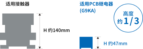 為了解決這個(gè)發(fā)熱課題而開發(fā)的產(chǎn)品便是G9KA型高容量功率繼電器。G9KA在行業(yè)內(nèi)實(shí)現(xiàn)低接觸電阻0.2mΩ,有效抑制了作為小型化、高容量化重大課題的發(fā)熱。此外,與同等電流容量的接觸器相比,高度采用只有其1/3左右的緊湊型尺寸,有助于實(shí)現(xiàn)設(shè)備的小型化、省空間化。
