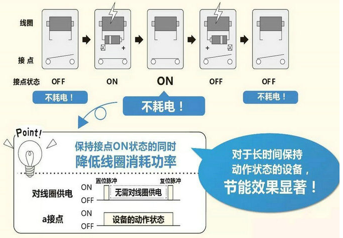 鎖定功能:在施加線圈電壓時(shí)將接點(diǎn)置ON或OFF即使斷開(kāi)線圈電壓依然保持該狀態(tài)的功能。在設(shè)備的動(dòng)作狀態(tài)下降低線圈消耗功率,為節(jié)能作出貢獻(xiàn)。