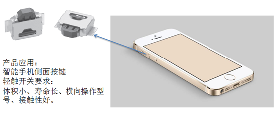 (一)智能手機:建議使用橫向操作型號開關(guān)B3U-3000P-B型號,用于智能手機側(cè)面按鍵,功能為控制開關(guān)電源、控制手機喇叭的音量。