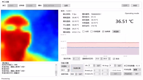 同時支持USB轉UART和UART直接輸出。UART波特率默認115200,8數(shù)據(jù)位,1停止位,無校驗。其中用戶的控制端是主機,測溫模組是從機,采用一發(fā)一收。