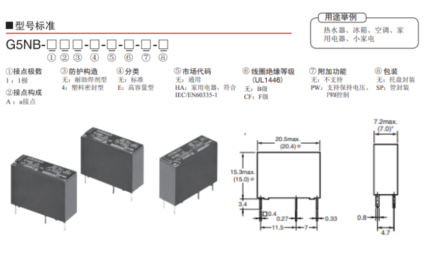 G5NB功率繼電器是一款多樣化選擇的繼電器,耐沖擊電壓10kV的1極3A/5A開閉的小型功率繼電器,采用了高功率電磁回路,實現高靈敏度(200/mW)同時去獲得了UL、CSA、VDE的認證,用途符合EN61010強化絕緣標準要求,歐姆龍G5NB-()-PW型的支持電壓,PWM控制,有助于節能,一下是G5NB的一個型號標準,尺寸;
