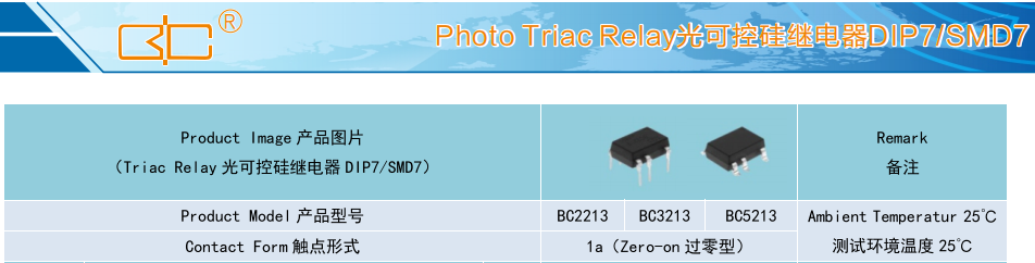 (Triac Relay 光可控硅繼電器 DIP7/SMD7),Product Model產品型號:BC2213/BC3213/BC5213,Contact Form觸點形式:1a(Zero-on 過零型),Ambient Temperatur 25'C,測試環境溫度 25℃℃