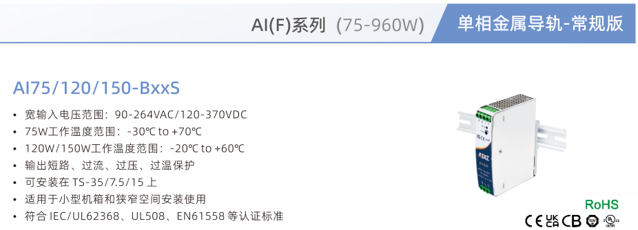 開關(guān)電源A175/120/150-BxxS, ?寬輸入電壓范圍:90-264VAC/120-370VDC ?75W工作溫度范圍:-30°Cto+70℃ ?120W/150W工作溫度范圍:-20°Cto+60°C ?輸出短路、過流、過壓、過溫保護 ?可安裝在 TS-35/7.5/15 上 ?適用于小型機箱和狹窄空間安裝使用 ?符合IEC/UL62368、UL508、EN61558等認證標準