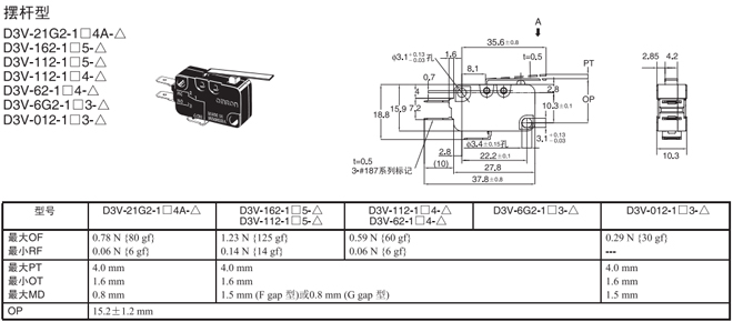 | 擺桿型 | 內部安裝 | 1.23N {125gf} | D3V-162-1□5-△ | D3V-162-2□5-△ | D3V-162-3□5-△ |
