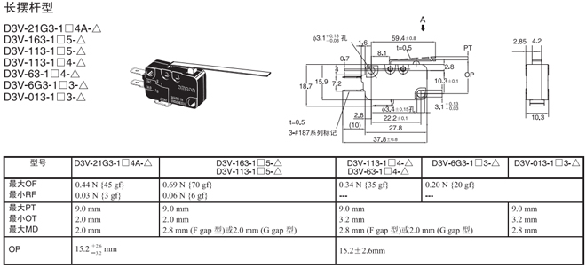 | 長擺桿型 | 內部安裝 | 0.69N {70gf} | D3V-163-1□5-△ | D3V-163-2□5-△ | D3V-163-3□5-△ |