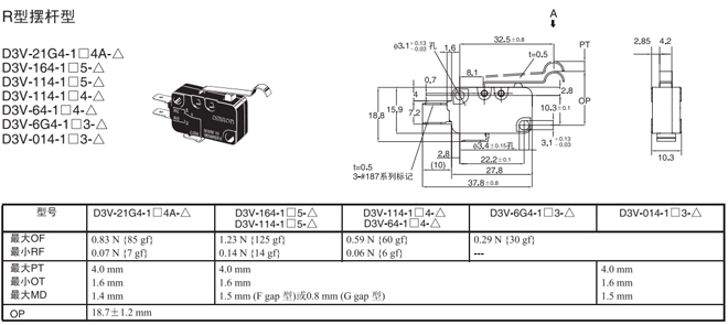 | R型擺桿型 | 內部安裝 | 1.23N {125gf} | D3V-164-1□5-△ | D3V-164-2□5-△ | D3V-164-3□5-△ |