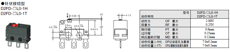 D2FD-2 超級小型基本開關(guān) 兼具防塵功能的極超小型基本開關(guān) 利用橡膠封裝的密封結(jié)構(gòu)實現(xiàn)防塵 (IEC IP6X)。可在有灰塵、紙粉的環(huán)境下使用。 可動片為1片彈簧構(gòu)造,支持AC125V 2A開關(guān),更有微小負載型可供選擇。 還備有焊接、印刷基板用端子。