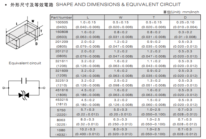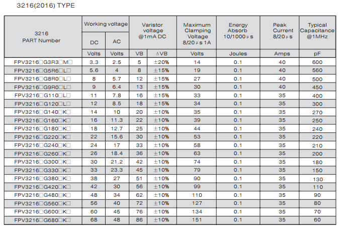 特征: 1、疊層片式陶瓷結(jié)構(gòu)。 2、無引線。 3、溫度范圍:-55℃~+125 ℃。 4、工作電壓范圍V w(dc)=3.3~ 615V。 5、具有雙向限制特性,適合ESD保護(hù)。 6、漏電流非常小。 7、寄生電感小、響應(yīng)速度快(響應(yīng)時(shí)間少于0.5ns)。 8、優(yōu)良的溫度系數(shù)。 9、良好的焊接性能(端電極為三層電鍍)。 應(yīng)用: 1、防止過電壓:當(dāng)施加的電壓升高到壓敏電壓時(shí),壓敏電阻器的電流急劇上升,被保護(hù)設(shè)備的浪涌電壓迅速減小,從而使裝有壓敏電阻器的設(shè)備抗浪涌噪聲能力達(dá)到相應(yīng)要求。壓敏